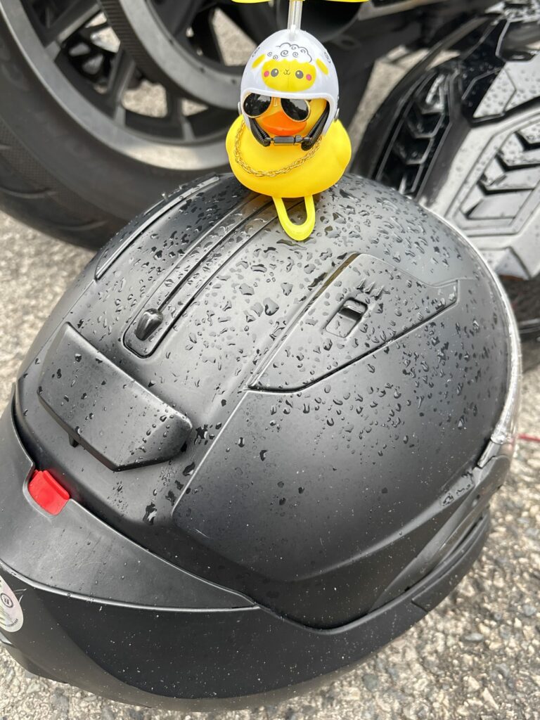 Keggle wanted to sit in the rain on Bob’s helmet after being rescued from Mat’s plastic bag
